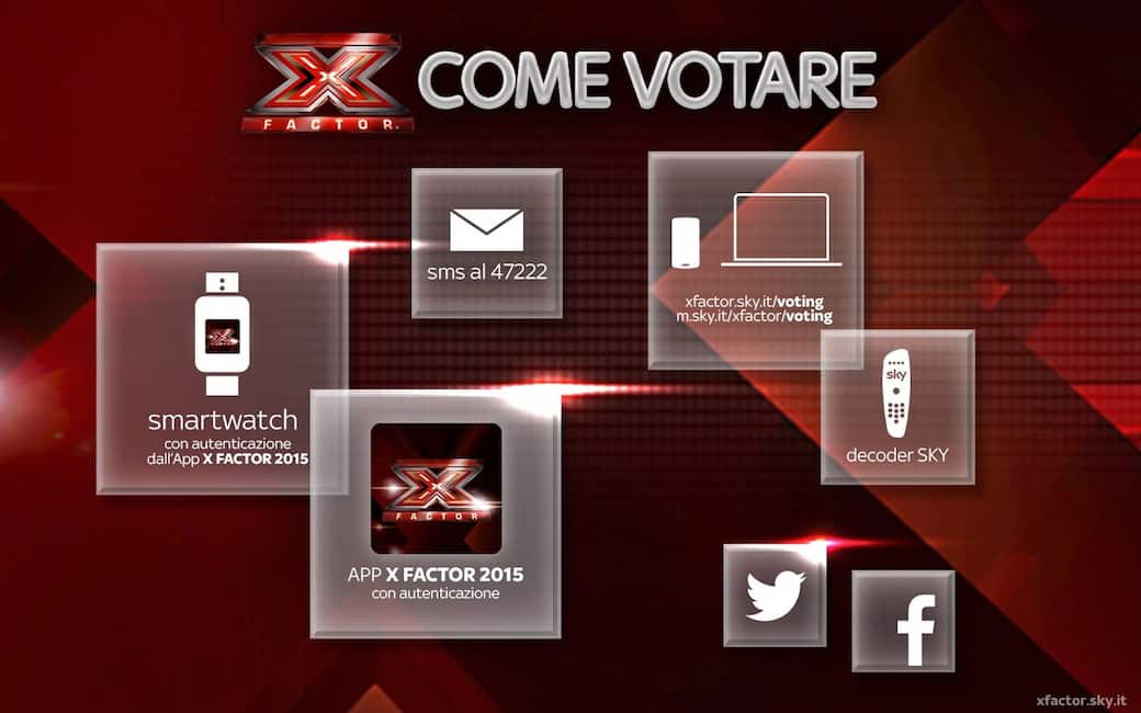 X Factor non esisterebbe né senza di voi né senza il vostro voto. Anche quest'anno avete tantissimi modi per votare il vostro talento preferito. Avete il cellulare scarico? Andate su Facebook e Twitter per esprimere la vostra preferenza. Non avete sotto mano il computer? Potete votare tramite il decoder di Sky