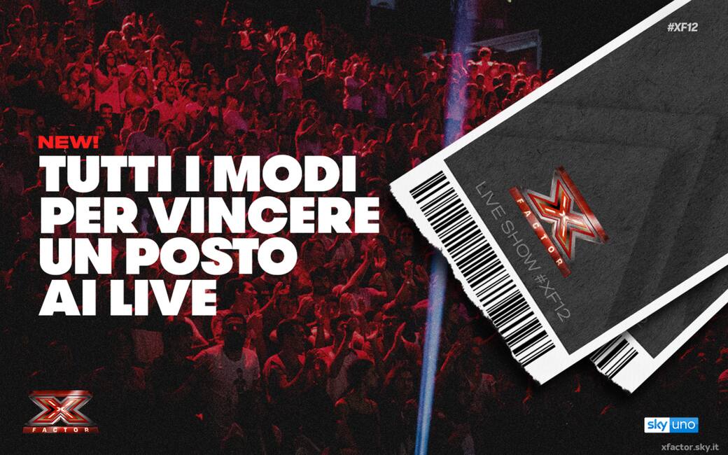 Dopo quattro puntate di Audizioni, due di Bootcamp e la scelta finale degli Home Visit, finalmente siamo arrivati agli attesissimi e temutissimi Live Show di #XF12! Dodici concorrenti, i migliori, si esibiranno fino all’ultima nota e vi lasceranno senza fiato! Anche quest’anno avrete la possibilità di assistere dal vivo ai Live Show di X Factor 2018 e di vivere la vostra esperienza a 360 gradi, come solo un vero fan sa fare! Per vincere i biglietti per i Live Show di #XF12 e tifare la vostra categoria preferita - le Under Donne di Manuel Agnelli, gli Over di Fedez, gli Under Uomini di Mara Maionchi e i Gruppi di Lodo Guenzi - avete diverse possibilità e noi siamo qui per indicarvele tutte! EXTRA DI SKY Per i clienti Sky da più di 3 anni, con extra i Live Show e La Finale non sono solo in TV! Potreste vivere l’emozione di XF12 dal vivo, supportare i vostri talenti musicali preferiti e urlare direttamente dalla X Factor Arena che c’eravate anche voi