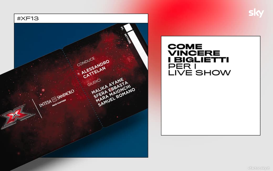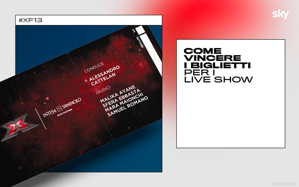 Dopo tre puntate di Audizioni, due di Bootcamp e le scelte finali degli Home Visit, finalmente siamo arrivati agli infuocatissimi Live Show di #XF13! Dodici concorrenti, i migliori arrivati fin qui, si esibiranno sul palco più temuto di sempre. Anche quest’anno X Factor vi dà la possibilità di assistere da vicino ai Live Show e di vivere il talent come solo un vero fan sa fare! Per prendere parte ai Live e tifare i vostri concorrenti preferiti della categoria Over di Mara Maionchi, Under Uomini di Malika Ayane, Under Donne di Sfera Ebbasta e Gruppi di Samuel avrete diverse possibilità e vi basterà seguire dei semplici passaggi: INTESA SAN PAOLO Ogni giovedì dalle 18:00 alle 23:59 accedete all’app Mobile di Intesa Sanpaolo e giocate con Reward